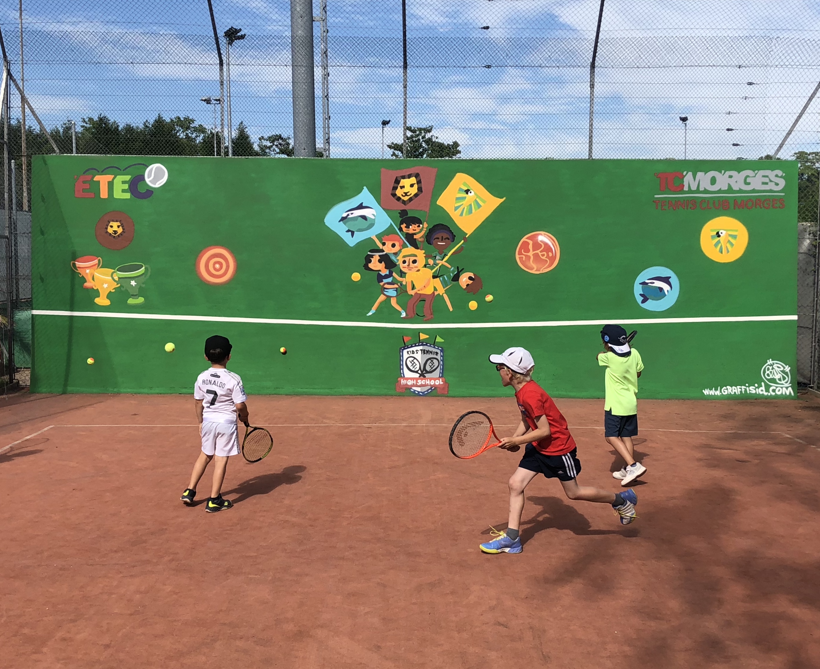 Notre mur fait peau neuve en mettant à l’honneur la KIDS tennis high school! Nos nombreux jeunes pourront désormais viser les cibles de leur équipe préférée (lions, perroquets ou dauphins) en répétant leurs coups favoris.